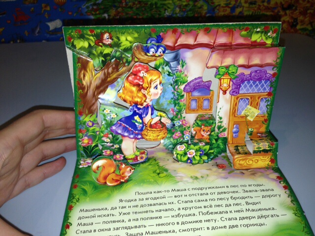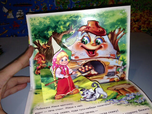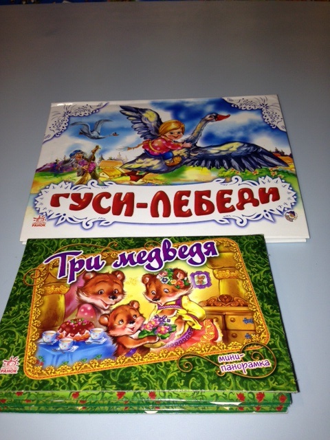 Книжки-панорамки. Их у нас две - Три медведя совсем маленького формата, Гуси-лебеди побольше. Лева ценит именно за панорамные иллюстрации. Книжки дешевенькие, но тем не менее пока целы, хотя Три Медведя Лева приносит читать через день и именно в этом формате.