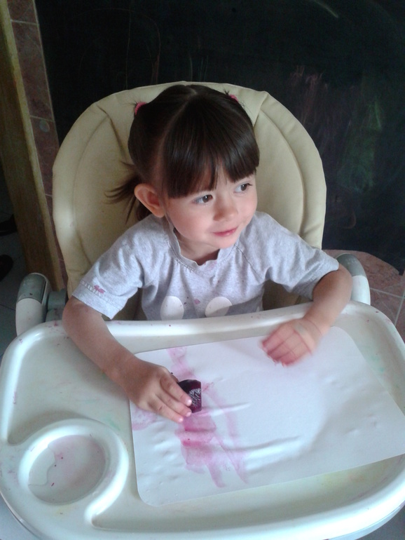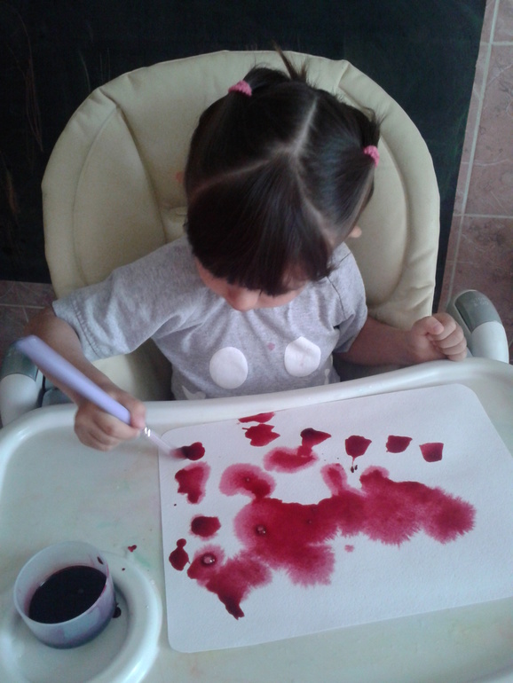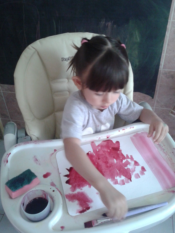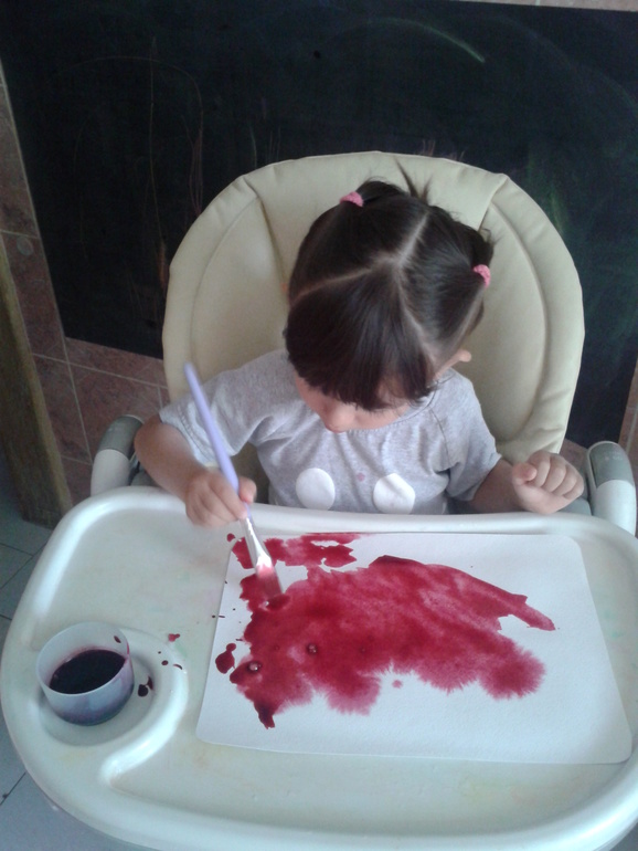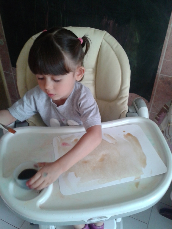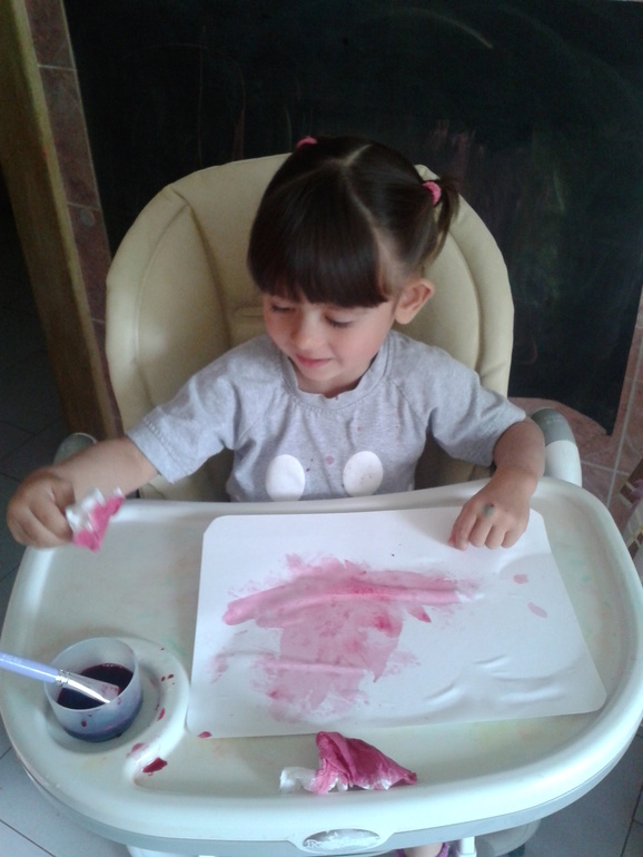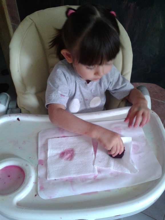 Можно так же и тряпочки красить, думаю будет очень увлекательно (и грязно!). Вот советчикам, которые говорят, что ребенку в творчестве нужна свобода не только полета фантазии, но и свобода движения, хочется посмотреть в глаза и спросить: -А вы пробовали отмывать свекольный сок с пола (благо плитка) и др. поверхностей? Рисовать так можно только на кухне и по моему мнению, желательно в детском стульчике.