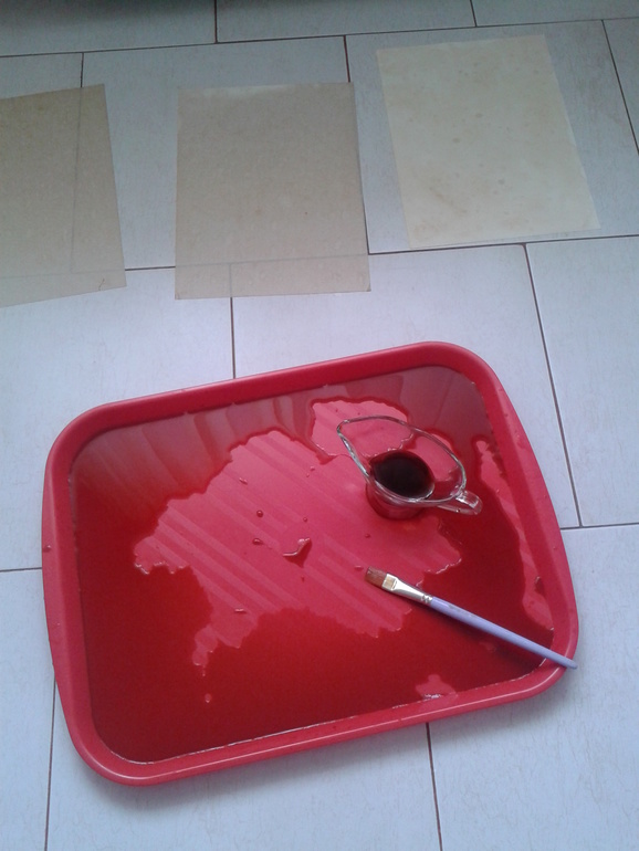 Затем рисовали, а точнее тонировали листы смесью кофе и цикория (кофе развела маловато, а вот цикорий дает хороший темный цвет, решила добавить кофе для запаха):