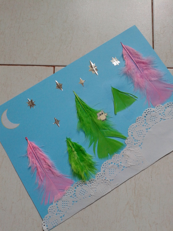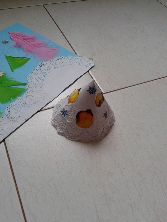 Осуществленные идеиВ запасах долго лежали перья и бумажные ажурные салфетки (салфетки - это идеальный снег для поделок!). И вот пригодились.
