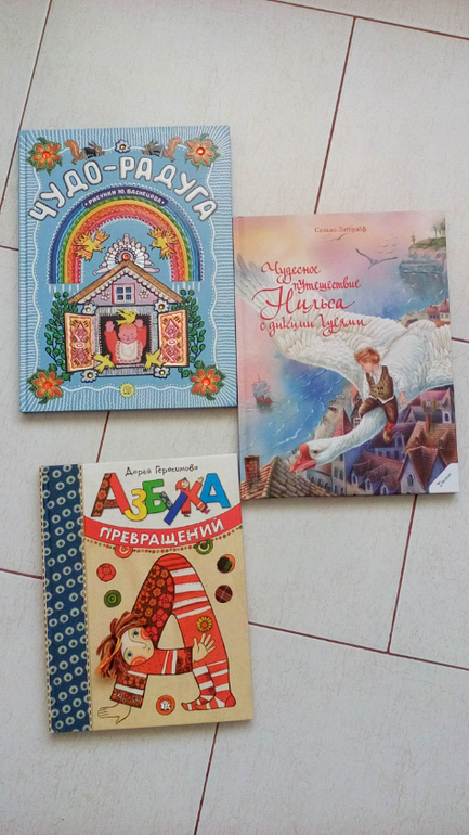 Качество печати всех книг превосходное. Про Нильса книга была плановой, т.к. Соне очень нравится советский мультик "Заколдованный мальчик", ну и книга тоже пришлась по душе, хотя там больше приключений. Радуга и Азбука были куплены потому что та-дам - скидка была. Радуга, конечно, для более младшего возраста, но качественную книгу приятно посмотреть в любом возрасте (даже в моем).