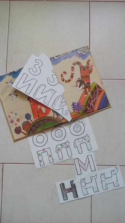 Я честно не видела, что там ещё кармашек с контурами букв из Азбуки. Хотела все картинки откопировать, но не успела. Как видно на фото, Соня их использует по своему усмотрению: клеит на них наклейки, само собой - раскрашивает и даже вырезает буквы фигурными ножницами.