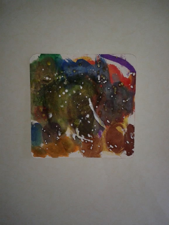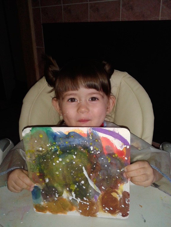 Сначала на чем рисовали: я увидела в Леонардо толстый картон и решила, что неплохо бы попробовать на нем порисовать (и не ошиблась - надо ещё накупить листов разного формата). Взяла на пробу маленького формата (20 на 20см, цена 19 руб), округлила ножницами края. Рисовали на нем икеевской акварелью, цвета использовали все. Вообще рисование акварелью сложновато для малышей, это вам не банка с гуашью, поэтому я намазывала краску на кисточки, а ребенок уже творил сам. В конце помогла ей набрызгать с помощью постукивания кисточки об кисточку "звездочки".