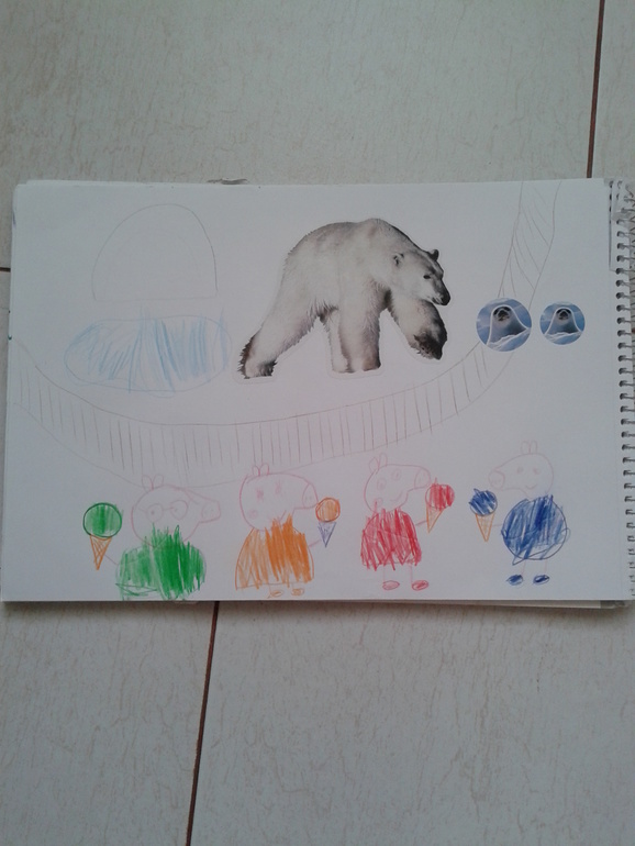 Вот картина Пеппа с семьей в зоопарке (контуры моего исполнения, зарисовка 100% дочки). Одни ботинки чего стоят. Соня действительно очень старалась, причем я заметила, любимицу Пеппу вырисовывала, а остальных уже не так. Я не знаю как заштриховывают другие детки в возрасте 2 г 7 мес, но наш результат мне нравится. Хрюкаю от удовольствия.