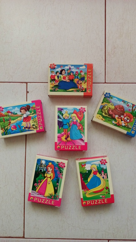 Хочу рассказать о пазлах от "Рыжего кота". У нас в магазинах они стоят от 15 до 40 р в зависимости от количества деталей (от 12 до 50 дет.) Те, что на фото стоят: из 24 дет - 15 р, 35 дет- 17 р. При такой смешной цене качество удивляет и радует. Ассортимент пазлов огромный, там и животные, и сюжеты из сказок и мультфильмов. Я когда первый раз, по совету подруги, зашла в магазин за ними, то провела у полочки с этими пазлами 20 минут точно, выбирая то, что как мне кажется понравилось бы дочке (обязательное присутствие желтого цвета). На фото нет ещё коробочки с пазлами из сказки "Изумрудный город", потому что Соня как раз его собирала.