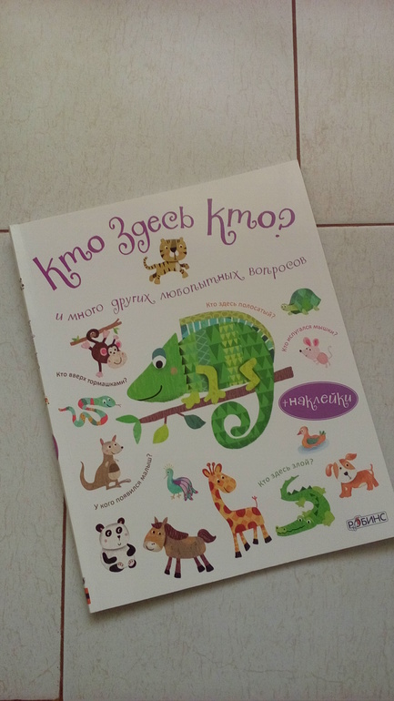 В "Леонардо" приобрела новое пособие-гляделку "Кто здесь кто?" изд. Робинс. На 15 разворотах нарисованы животные, наверху страниц написаны различные задания -Кто умеет плавать? Кто кого поливает водой? Кто изменил свой цвет? Кто здесь спит? Кто исчез? У кого появился малыш? и т.д. В конце на 3-х страницах наклейки, страницы плотные.