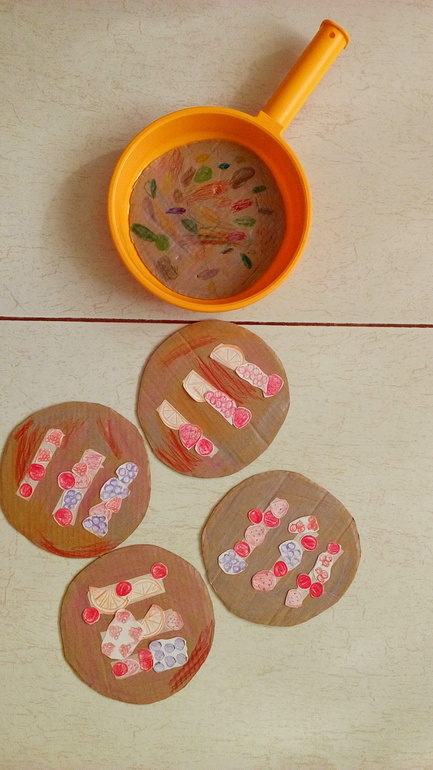 Картонные блины украсили я годами и фруктами (наклеивали на двусторонней скотч). Соня "намазала" все блины разными "джемами".