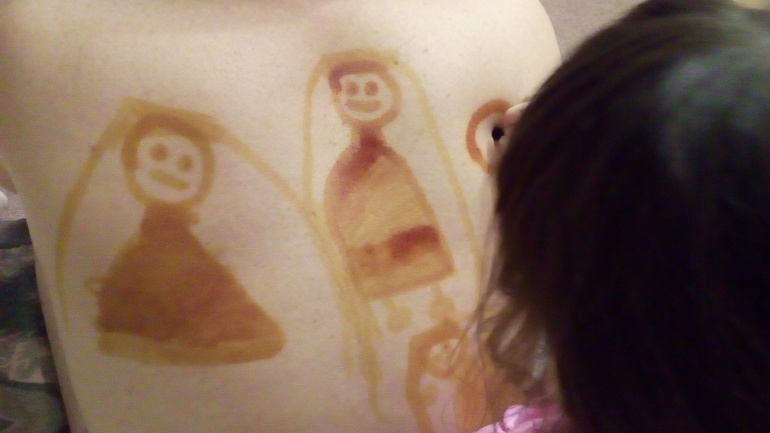 Вот так наш папа иногда проводит время с ребенком: папа смотрит интересующее его видео, а ребенок увлеченно рисует йодом лялюшек на папе. Все довольны.