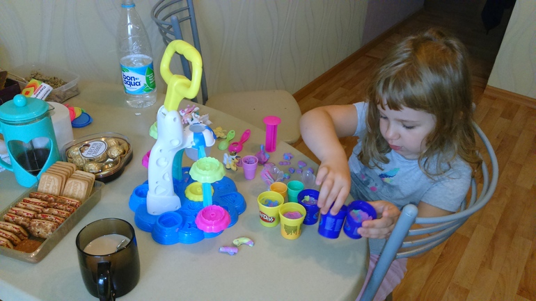 Рекомендацию запомнила, но на фоне приближающихся родов отложила до первого похода по магазинам. И вот 25 августа пришла я приводить в порядок волосы перед встречей с Арианой (мой мастер-колорист работает на дому) и что я вижу?! Настин сын 4х лет самозабвенно что то выжимает и выдавливает в "фабрике тортиков" от вышеупомянутой марки. Малыш только недавно начал разговаривать, ленивый карапуз до безобразия, умный - бесспорно, но лееееентяяяяяяяй дикий. Это реально про него анекдот :