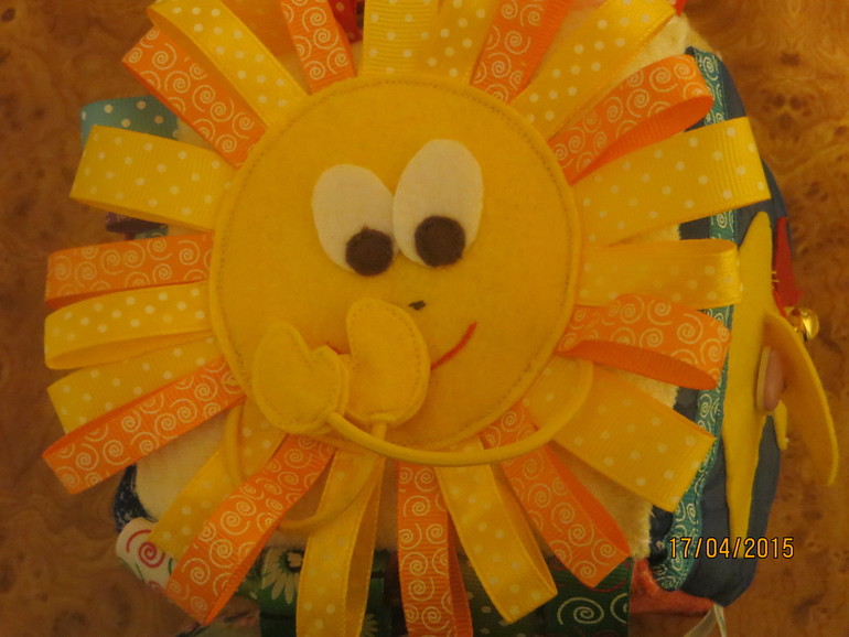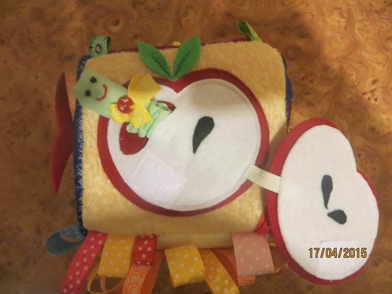 Каждая сторона выполнена на ткани с интересной фактурой, и трагая ребенок так же развивает моторику.