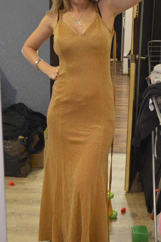 Вечернее платье золотисто-песочного цвета 42-44-46 (тянется).Шилось самостоятельно.Сзади по спине качель,ее можно перешить ,сделать просто открытую спину. (могу перешить я +500экв ) На хорошую грудь не меньше 2,5- 3 размера.Есть крохотный ньюанс совсем невидимый.спереди зашита малюсенькая дырочка,если не сказать,то и не заметите никогда)поясок я уберу,он лишний по-моему.цена 400 руб.