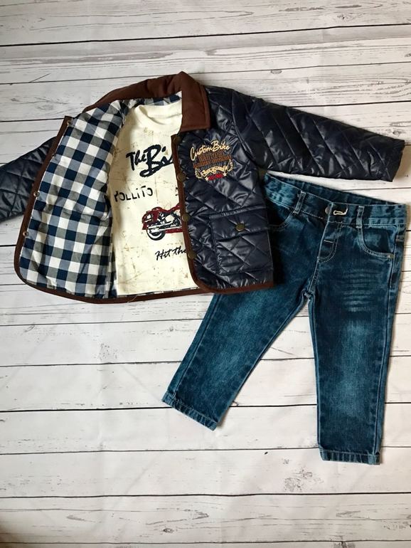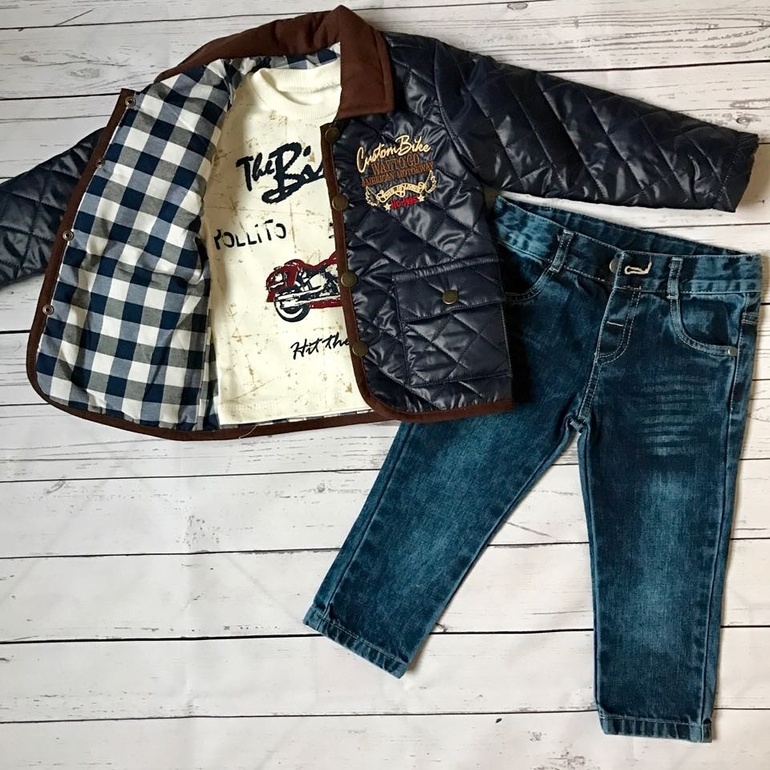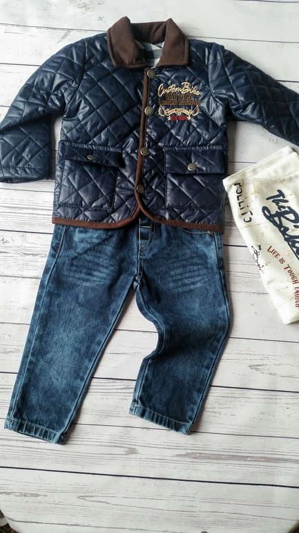 стеганая куртка на синтепоне, кофточка с длинным рукавом и джинсы.