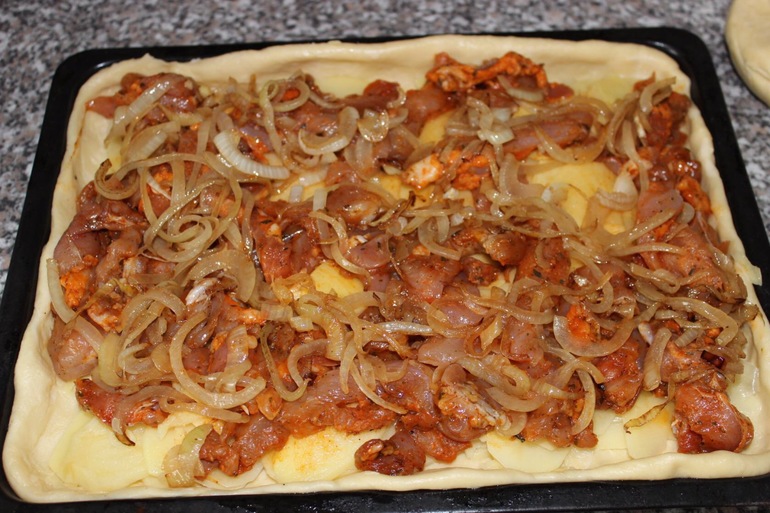 Затем мясо и лук (который я обжариваю заранее полукольцами)