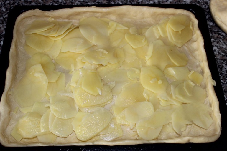 Затем делим на две части, смазываем противень маслом и раскатываем один пласт, тесто очень мягкое и работать с ним можно даже просто распределяя руками, по всей поверхности