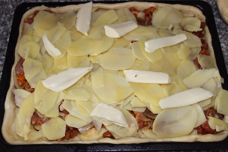 Раскатываем второй пласт и накрываем пирог, делаем дырочку посередине и смазываем одним желтком, смешенным с чайной ложкой воды.