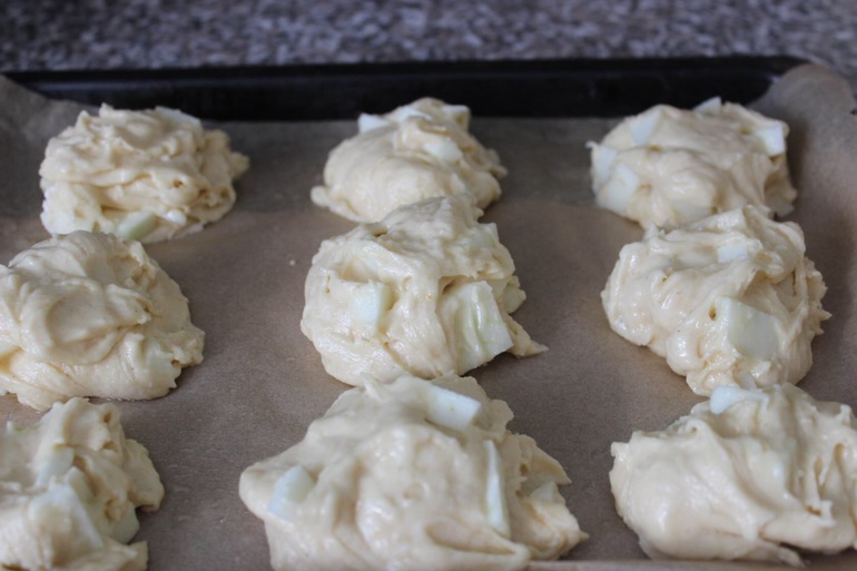 и просеянную муку (тесто как на густые оладьи), добавляем нарезанное кубиком яблоко,