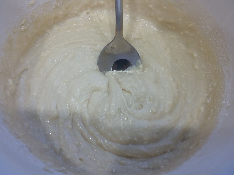 Перемешать миксером. Всыпать стакан просеянной муки и 0,5 ч.л. разрыхлителя, перемешать: