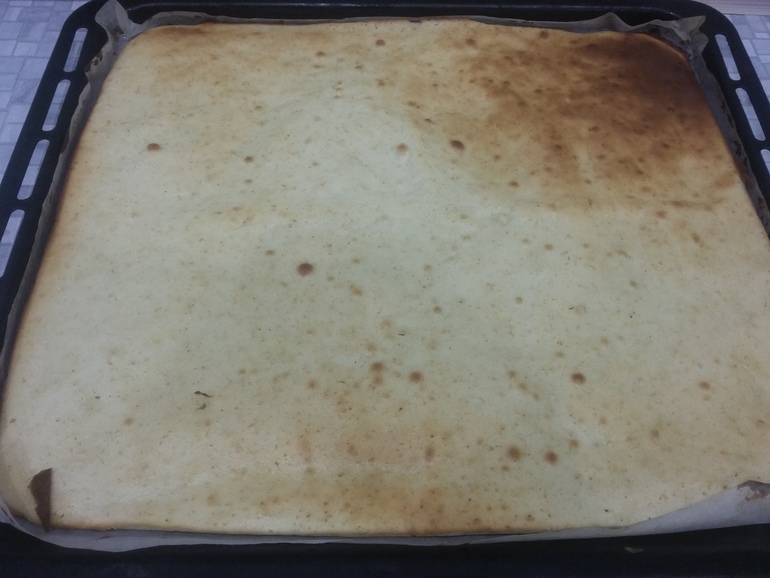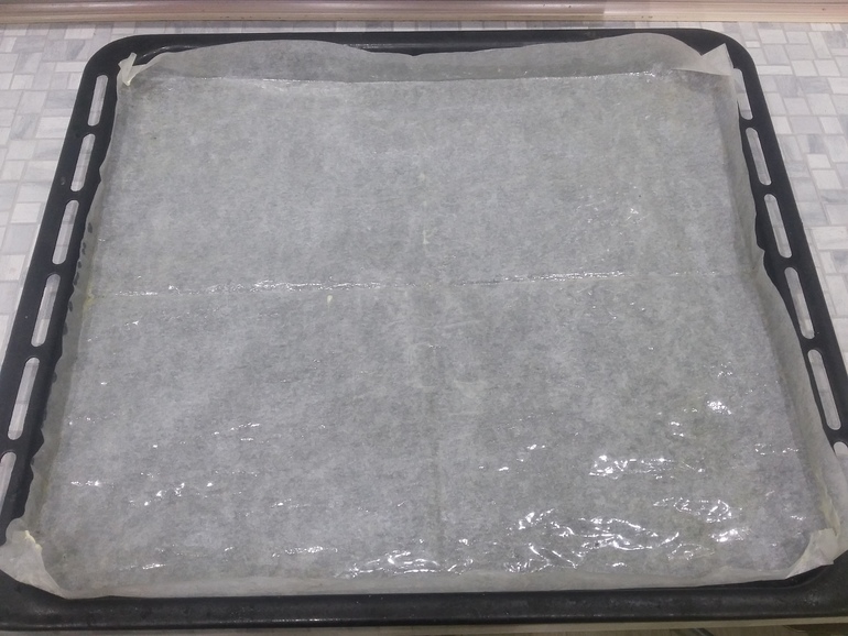 Противень застелить пергаментом, смазать сливочным маслом (удобно противень нагреть):