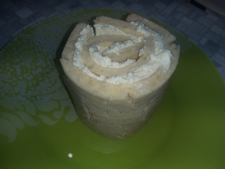 Следующие полоски также смазывать кремом и наматывать на рулетик на тарелке, формирую "годовые кольца" дерева. Оставшимся кремом смазать бока и верх торта.: