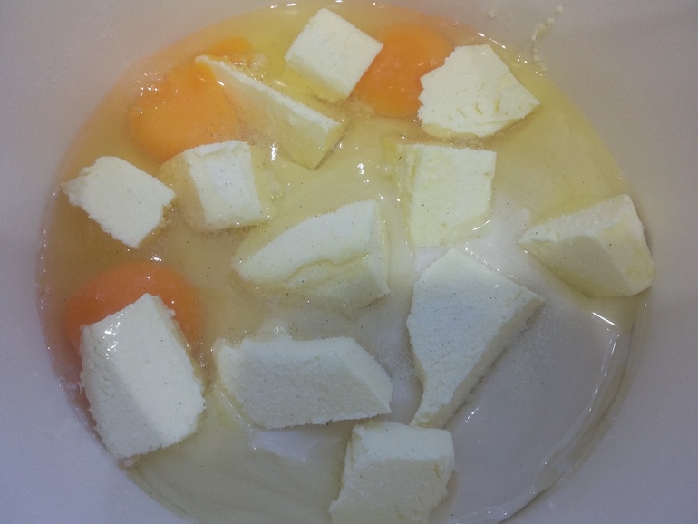 Нарезать 150 г мягкого сливочного масла, добавить щепотку ванильного сахара: