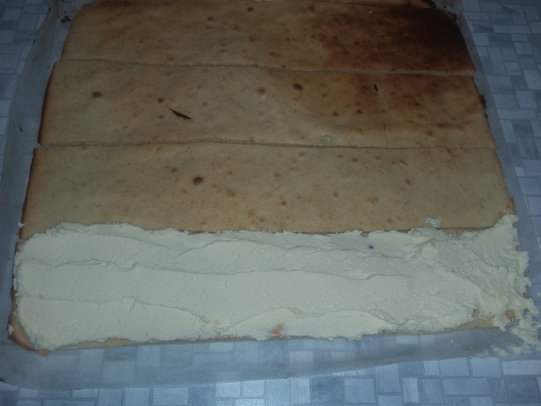 Остудить пласт. Нарезать на полоски, подровняв края:
