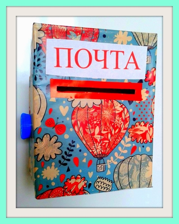 В ящике мы сделали отверстие (куда мы бросаем письма) и дверцу сбоку (чтобы письма вынимать). На дверцу приклеили ручку (из крышки от бутылки). Конвертики распечатали из интернета)))