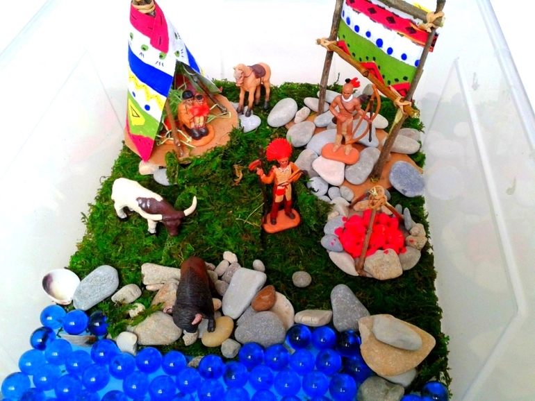 Признаюсь, что идею создания индейской деревни я подсмотрела в интернете. Ну уж очень мне эта задумка понравилась! И мы приступили к её воплощению. И хоть деревня получилась очень миниатюрная, играем в неё мы с большим удовольствием)))