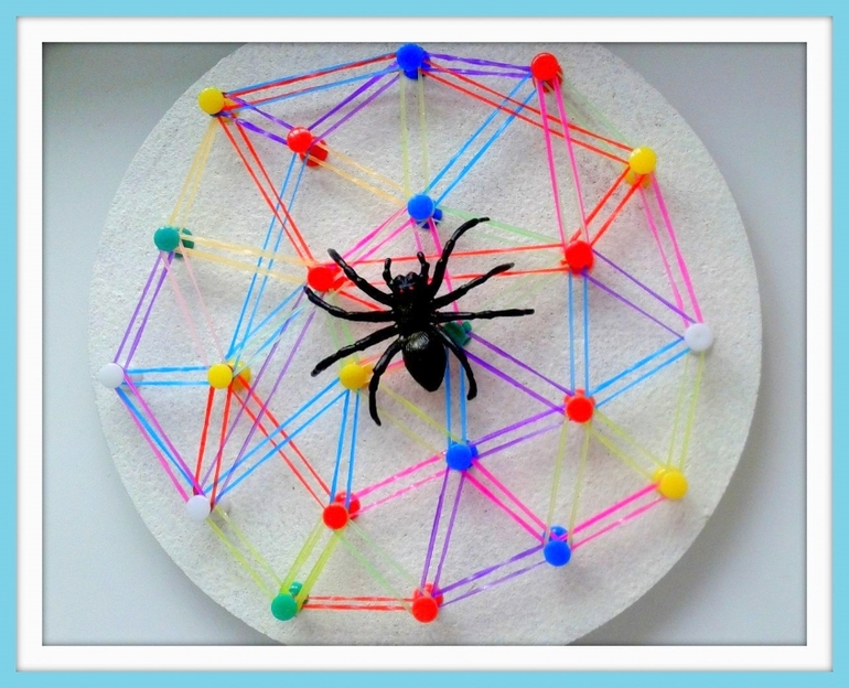 Это игра на развитие мелкой моторики. Для её изготовления понадобилась пробковая подставка под горячее и цветные кнопки-гвоздики (для безопасности кнопки приклеила клеем Момент). Чтобы сделать паутину для паука, нужно одевать резиночки на кнопки.