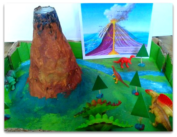 Вулкан мы сделали в технике папье-маше (основанием послужила пластиковая бутылка). Для проведения опыта под названием "Извержение вулкана" использовали: соду, воду, красный краситель, жидкость для мытья посуды и уксус.