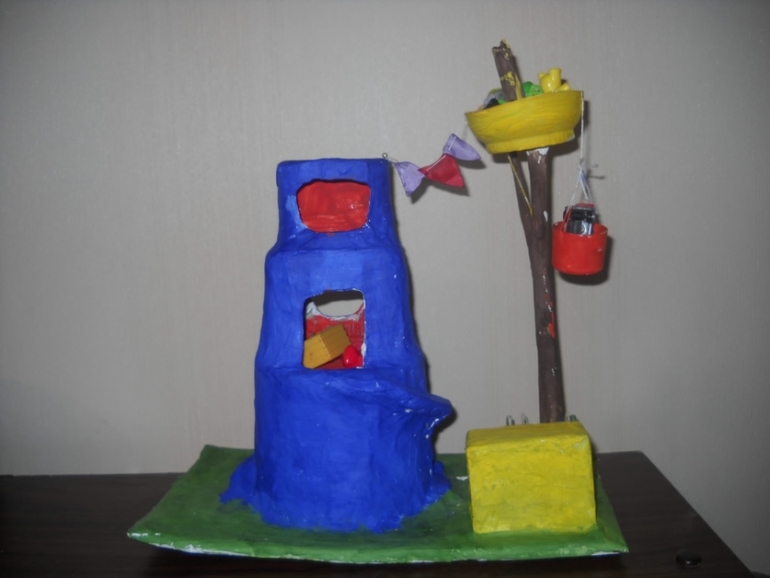 РазвивайкиБаночки из-подразностей (ведерко майонезное, пластиковый контенер, баночки от йогуртов и коробочка бумажная). Все обклеено слоями бумаги и газет. На "первом этаже" домика пирамидки пыталась изобразить серпантин. Дерево закреплено пластилиним и все той же бумагой. Клей использовала ПВА. Лебедка отдельная история. Использовала половинку от катушки для ниток, колпачок ручки, нижнее крепление вырезаноо из крышки от майонезного ведерка. Прикреплено все пуговицами и нитками.