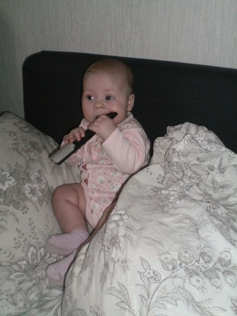 Сегодня моему солнышку, моей Пампусичке стукнуло 6 месяцев, она стала совсем большая. Спим 2-3 раза в день, всё время сидим, поём песенки, пьём из бутылочки, крутимся с живота на спину и обратно, нашли для себя забаву под названием "побег с дивана за две секунды"правда пока что ещё ни разу не удалось улизнуть! любим погрызть пульт, печенье, корочку хлеба. Радуем маму и папу каждый день, вообщем растём развиваемся умнеем.