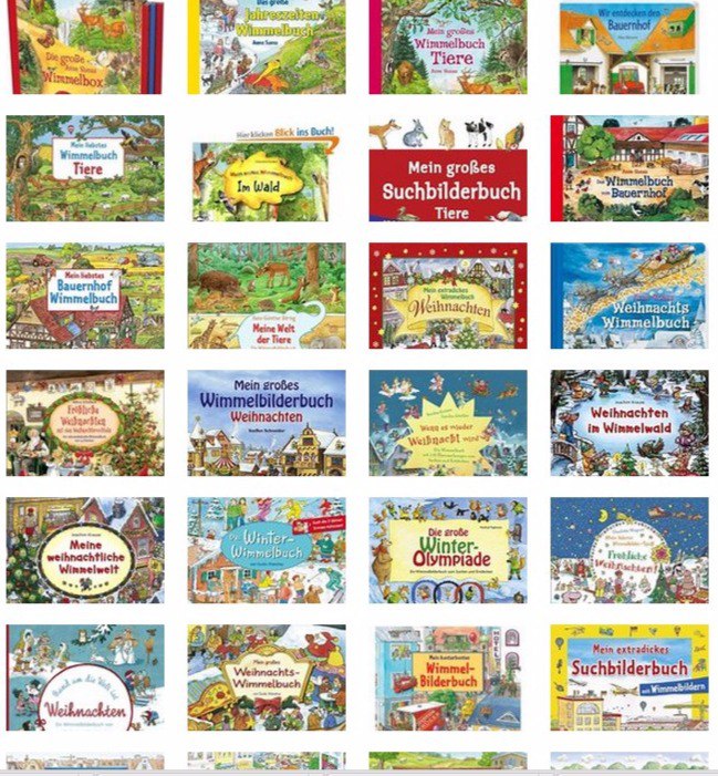 Родина Виммельбухов, книг для рассматривания -Германия. Там этот жанр пользуется огромной популярностью и виммельбухов выпускается множество, на любую тематику, вкус и кошелек. Любовь к виммелям детей и родителей оправдана, ведь книги-картинки имеют огромный ресурс для развития ребенка. Разглядывая красочные развороты ребенок узнает больше о мире, пополняет словарный запас. Позже малыш учится рассказывать по картинке, находить причину-следствие и задавать вопросы. При "чтении" виммельбухов развивается не только речь,но и воображение.