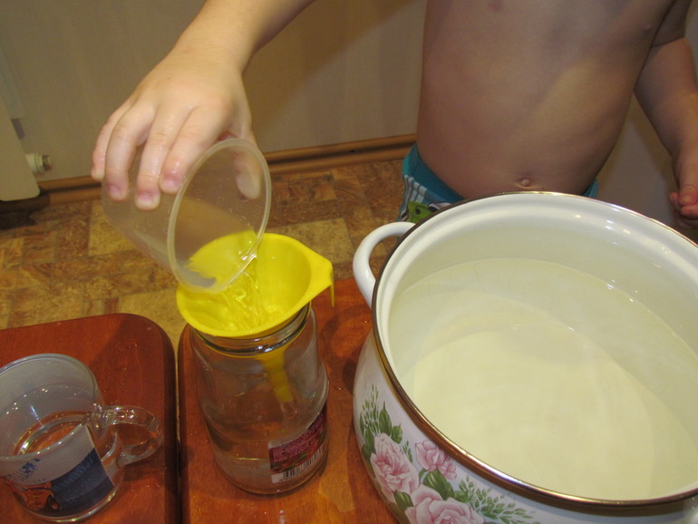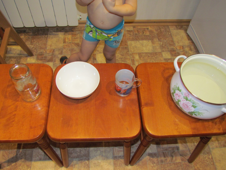 1. Сколько мерных стаканчиков помещается в разную тару (кружку, банку, миску). Больше всего понравилось переливать воду в банку с воронкой.
