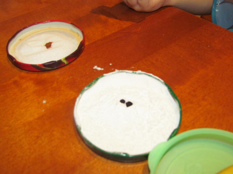 2. Лаборатория в тарелке: в крышки с солью, сахаром, картофелем, крахмалом добавляли по капельке йода и смотрели, где поменялся цвет. Честно, суть опыта особо не объясняла, в больше степени рассматривали этот эксперимент в качестве "фокуса-покуса". Был еще кусочек черного хлеба, но пока до него дошла очередь, он был съеден экспериментатором))) Перед проведением "опыта" пробовали на вкус и просто возились пальчиками в смесях.