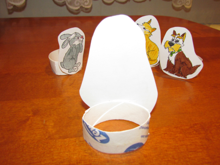 Распечатала раскраски на бумаге для черчения (она более плотная, так что не пришлось наклеивать картинки на картон), раскрасила и наклеила на двухсторонний скотч на колечки от втулки туалетной бумаги.