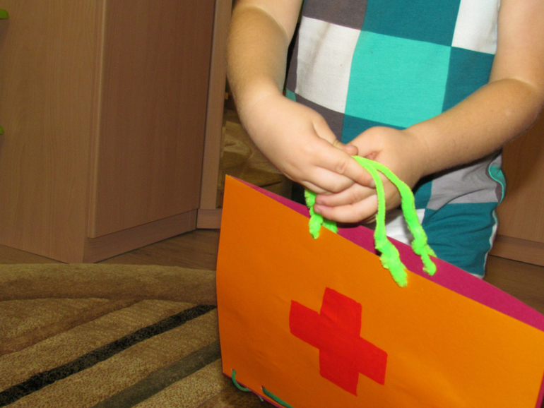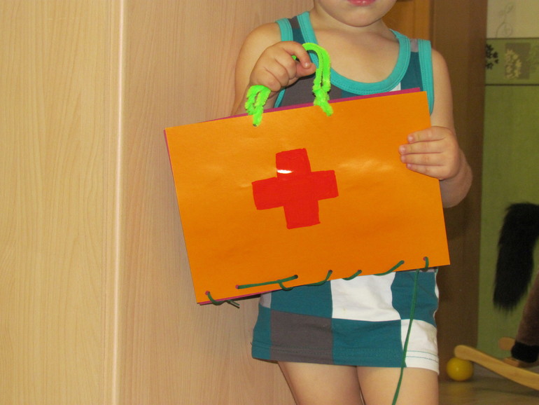 Распечатала листочек с "содержимым" чемоданчика и дала сыну - разукрашивать. В это время взяла два листа картона, дыроколом проколола нижнюю часть будущего чемоданчика + две дырочки для будущих ручек. Нарисовала красный крест.