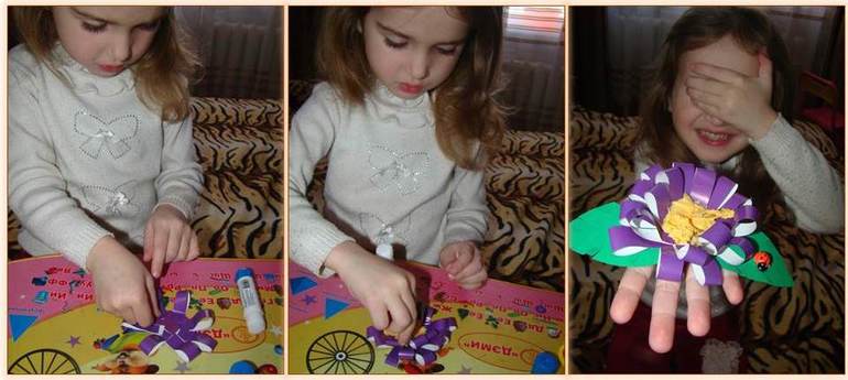 6) А ещё на прошлой неделе делали поделку - цветочек. Сначала Даша разрезала бумагу на полосочки, потом мы потренировались делать петельки из бумажных полосочек. Приклеили эти петельки (будующие лепесточки) на круглую основу - середина цветка. А серединку цветка сделали из мятых салфеток. И получился красивенький цветочек для бабушки.