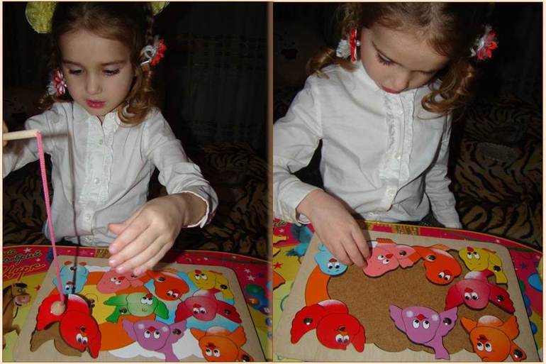 3) Ещё на том же сайте покупала интересные пазлы, соединенные с магнитной рыбалкой. Очень качественная игрушка, производитель "Крона". Сначала нужно поймать всех птичек, а потом по образцу нужно расставить птичек по местам. К игрушке прилагается черно- белая карточка, на которой показано, где должны располагаться все птички. Мы эту карточку раскрасили и теперь играем: и для моторики хорошо и в тоже время задание на внимательность.