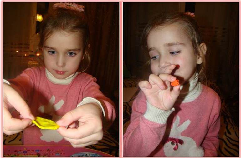 4. Лепка. Недавно наша тётя - мастер по лепке из полимерной глины и холодного фарфора - научила Дашу лепить розы. Оказывается всё очень-очень просто! Для начала скатываем маленький шарик, делаем из него плюшку, потом сворачиваем его в трубочку (именно трубочкой сворачиваем, не колбаской) Именно эта трубочка и будет серединкой будущей розы.