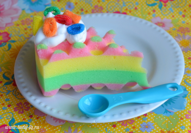 Как сделать: берем хозяйственную губку, разрезаем по диагонали - наш «радужный чискейк» готов! Сверху выдавливаем всю пену для бритья - в качестве взбитых сливок и посыпаем чем угодно.