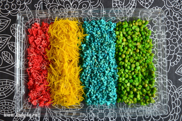 Как сделать наполнитель: берем фигурные детские макароны и «паутинку», перловую крупу и колотый горох. Все это окрашивается также, как и рис (пищевые красители + вода или спирт). Вместо «шоколада» - можно посыпать цикорий или молотый кофе.