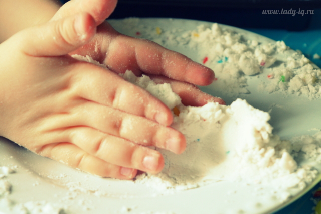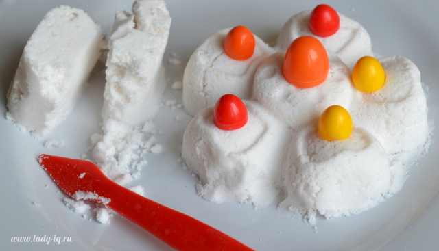 Это можно назвать и снегом, и песком и снежным песком, так как масса получается рассыпчатой, но из нее получаются отличные «куличики», как из песка.