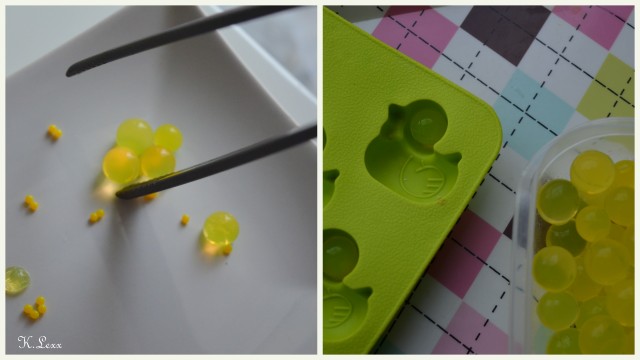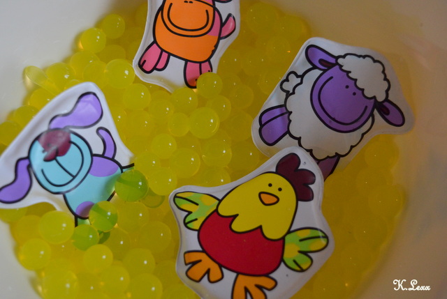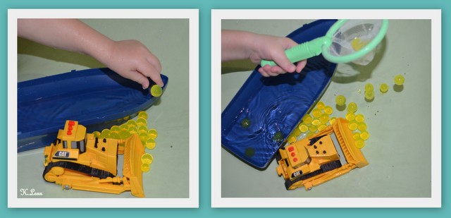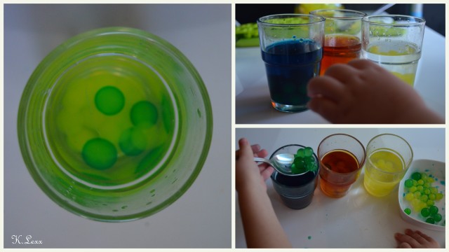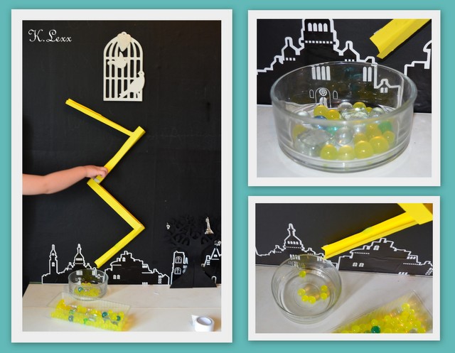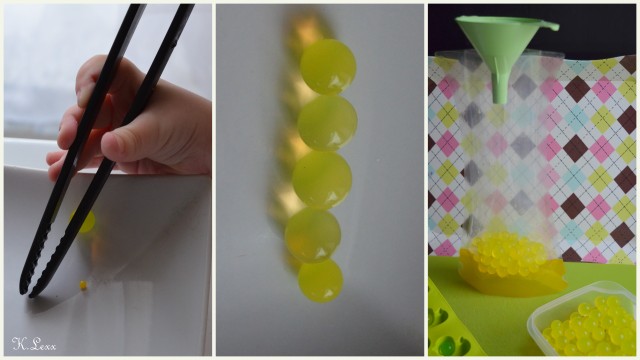 Все просто - кулинарные щипцы и контейнер для льда. Мы "кормили уток" этими шариками. Дело очень не простое, попробуйте захватить и удержать прыгающий скользкий шарик!!! А еще, пригодилась складная ваза из набора - туда помещается воронка и сортировка продолжается, на новый лад!