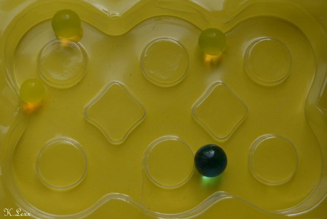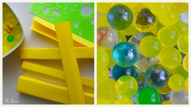Эти волшебные шарики очень необычные и приятные на ощупь. Сначала Андрюша их просто перебирал, запускал в контейнер с шариками ладошки, а потом он обнаружил, что они еще и весело прыгают (небольшая битва с шариками, все же произошла и я потом собирала этих "прыгунов" по всей кухне). Микс гидрогеля со стеклянными фигуры.Потом, я решила усложнить задачу и насыпала стеклянных шариков. Началось сравнение: - влажный-сухой, - твердый-мягкий, - катится шарик или скачет, - разные цвета и оттенки шариков - а также, в компанию шариков затесались стеклянные квадраты, поэтому формы тоже пришлось сравнивать. Вообще, у меня был гидрогель только желтого цвета, поэтому весь пост будет слишком насыщен ярко-желтым цветом! Но зато, Андрюша ооочень хорошо запомнил название этого цвета!