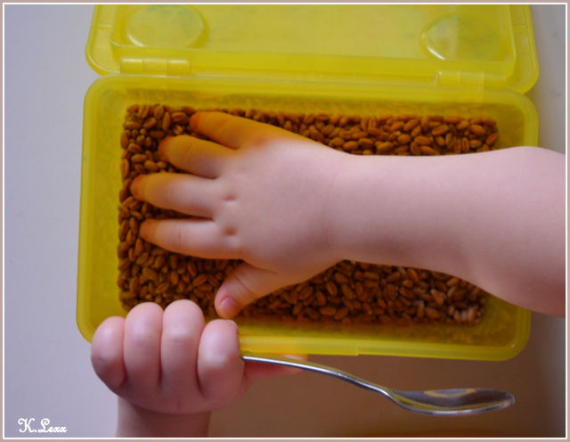 Кстати, зерна пшеницы в контейнере, стали для Эндрю очередной сенсорной коробочкой. Так что, не упускайте шанс развить мелкую моторику у ребенка, путем перебирания и пересыпания зерен пшеницы (правда, лучше подстелить что-то заранее, чтобы потом посеянную пшеницу не извлекать из всех уголков вашего дома).