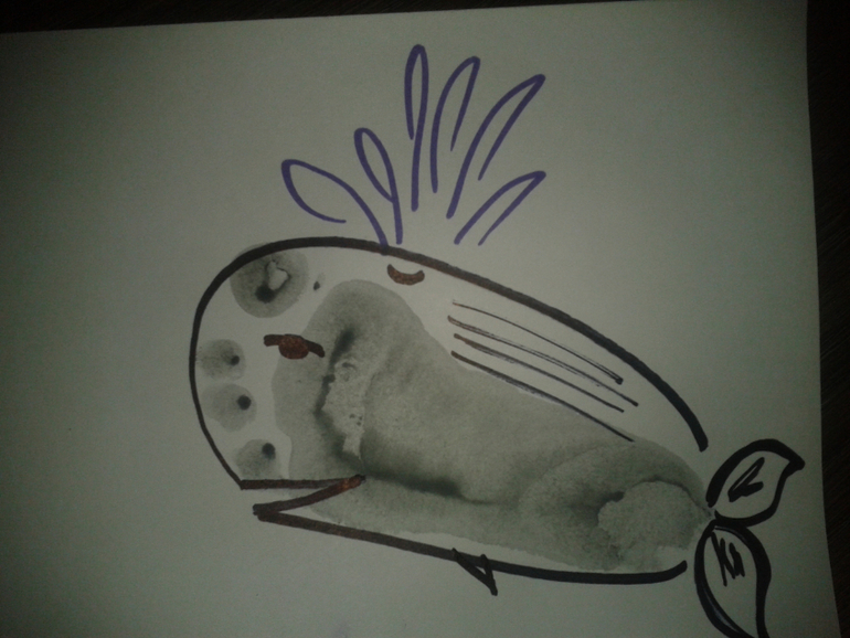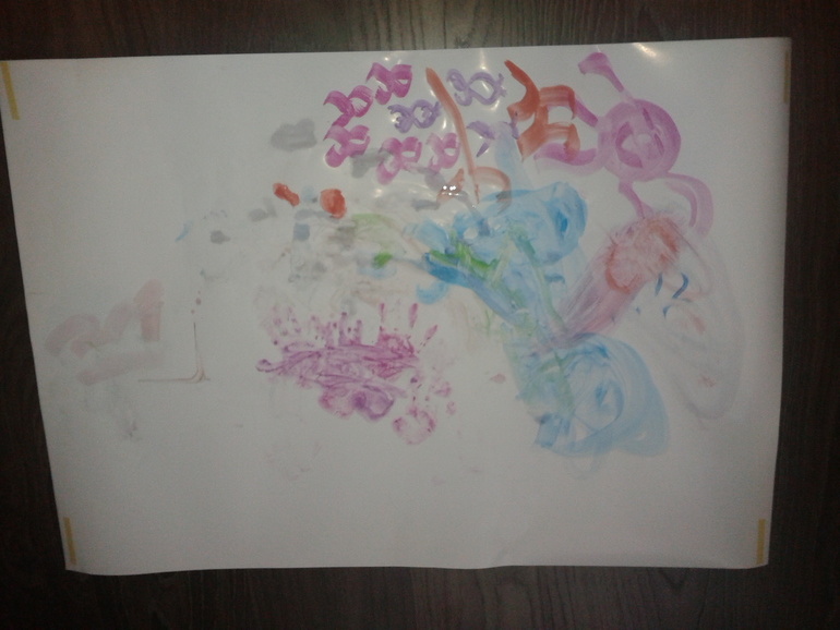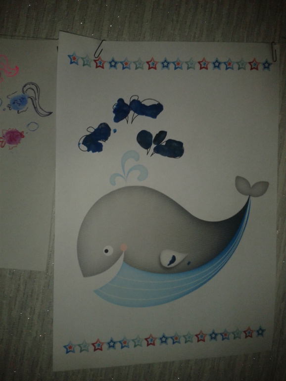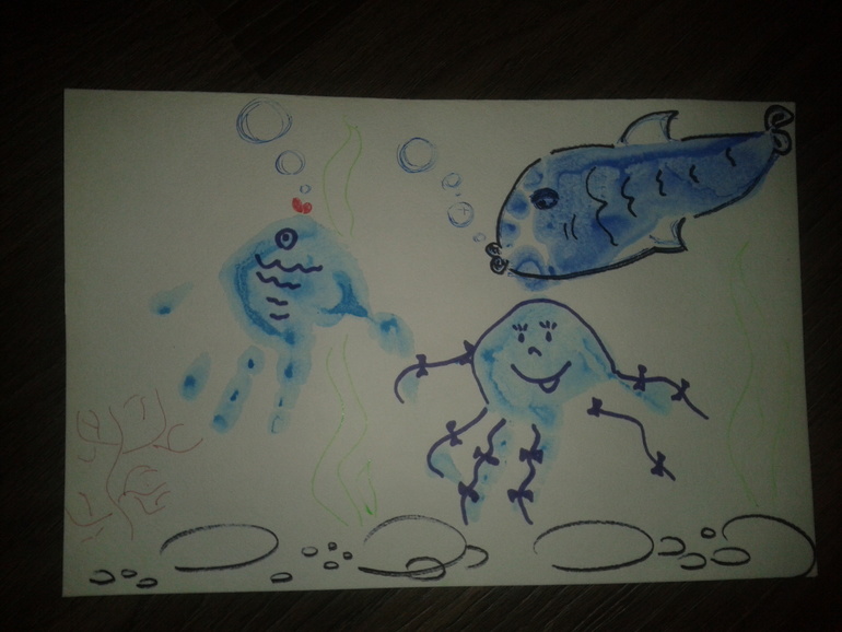 И снова творчество (сегодня вообще много рисовали). Сначала мы делали отпечатки ручек, ножек и пальчиков и затем нарисовали морских жителей: на первом фото две рыбки и осьминожек-девочка)) (эту картину подарим дедушке-моряку), на втором наши пальчики-рыбки, а на третьем... сама не пойму кто)) кит или кашалот))) Главное, ребенок доволен. Конечно, не обошлось без рисования на большом формате, рисовали море..