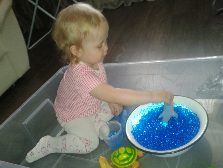 Дальше у нас было море из гидрогеля . Лисена все время играла одна (20 минут), пока мама хозяйничала