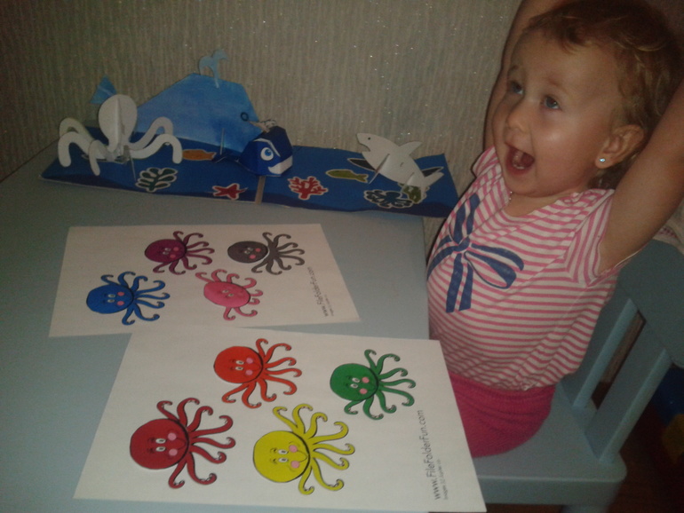 Нарисовавшись, мы пошли искать осьминожкам ножки.. Лисена все быстро сделала и закричала: "Ура!"))))