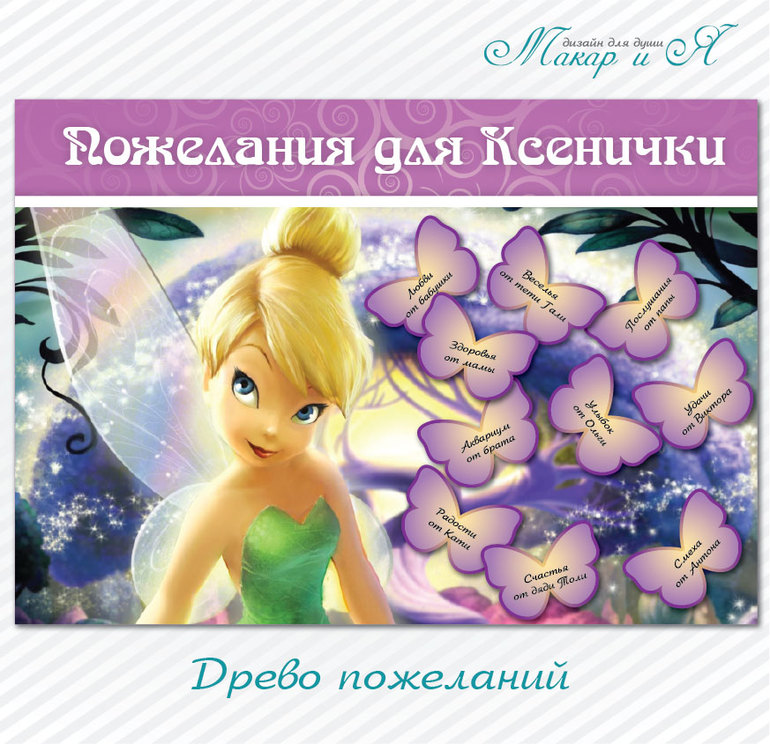 В двух словах суть в том, что вы вырезаете бабочек - на них гости пишут пожелания и приклеивают на красивый плакат - получается такое общее поздравление. Главное, что от гостей потребуется придумать всего пару слов - ведь так сложно писать много)) А для тех, кто хочет пожелать побольше всегда можно распечатать карточки пожеланий и сложить их потом в специальный конверт, чтобы хранить многие годы)