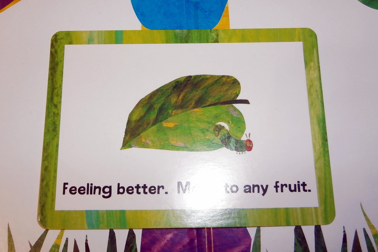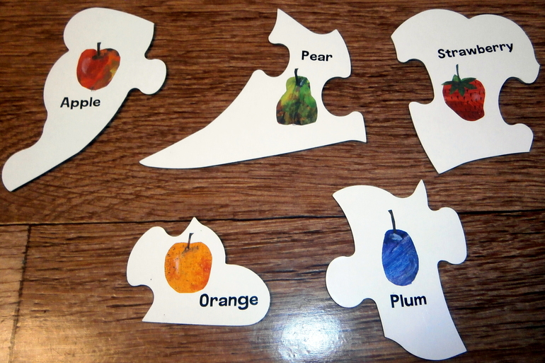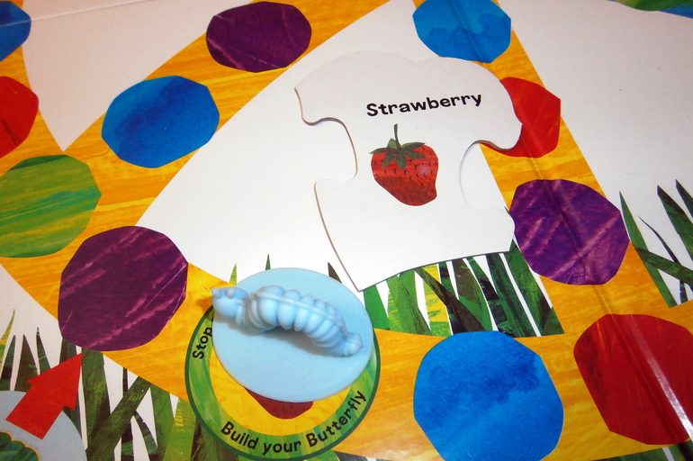 Если гусеница встала на кружок с фруктом, то игрок забирает себе соответствующий кусочек пазла. (В оригинальных правилах гусенице достаточно просто пересечь кружок с фруктом, чтобы получить кусочек пазла. Но мне кажется это очень упрощает игру).